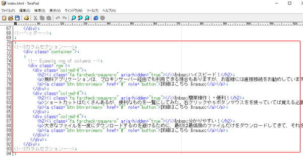 まずは「container」というクラスを付けて3列にしたい部分を<divで囲むぞ。